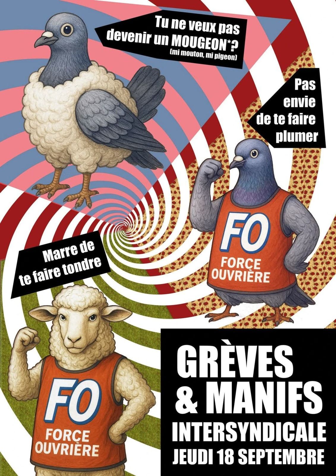 CFDT, CGT, CGT-FO, CFE-CGC, CFTC, UNSA, FSU, SOLIDAIRES appellent à une journée de mobilisation sur l’ensemble du territoire, le 18 septembre 2025, y compris par la grève et la manifestation. https://www.force-ouvriere.fr/IMG/pdf/20250829_cpintersyndical_mobilisation.pdf FO-Services Publics et Services de Santé appelle à la mobilisationdu 18 septembre La Fédération FO-SPSS soutient toutes les actions et tous lesmouvements, existants ou à venir, qui permettront de construire massivementla journée de grève et de manifestation interprofessionnelle du18 septembre 2025. https://data.over-blog-kiwi.com/7/05/06/52/20250902/ob_9f21a3_2025-09-02-communique-de-presse-fo.pdf